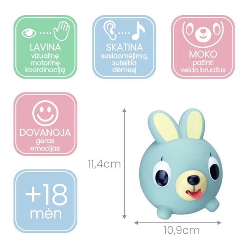Garsą skleidžiantis mechanizmas yra mechaninis, todėl džiugins vaikutį ilgą laiką. Skirti vaikams nuo 18 mėn. Vaikas gali išsirinkti jam labiausiai patinkantį gyvūną (meškutį, kiškutį, šuniuką, katytę ar vienaragį) ir mėgstamą spalvą.