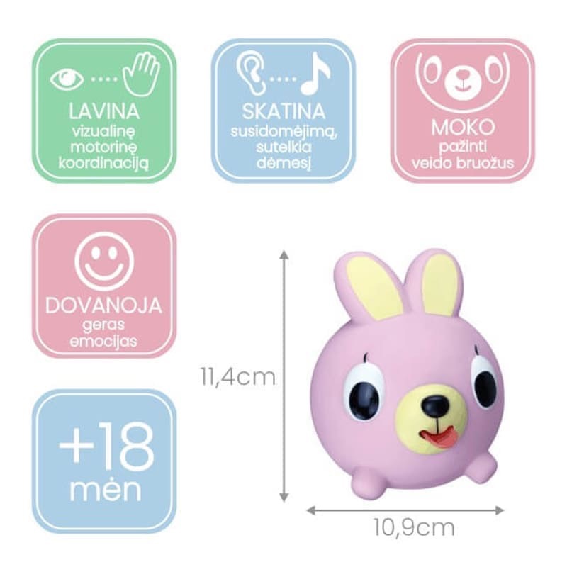Garsą skleidžiantis mechanizmas yra mechaninis, todėl džiugins vaikutį ilgą laiką. Skirti vaikams nuo 18 mėn. Vaikas gali išsirinkti jam labiausiai patinkantį gyvūną (meškutį, kiškutį, šuniuką, katytę ar vienaragį) ir mėgstamą spalvą.