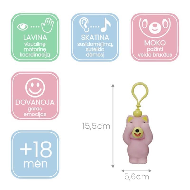 Jie tiesiog kviečia: „Suspausk mane ir džiaukis“! Nuotaikingai iškišdami liežuvėlį ir skleisdami smagų garsą, žaisliukai akimirksniu įtraukia į žaidimą ir pasižymi lavinančiomis savybėmis. Neramų kūdikį nuramins, o didesniam vaikui dovanos daug džiugesio. Pamilti jį taip lengva! Minkštas, malonus liesti draugas privers nusišypsoti kiekvieną – tereikia išsirinkti mėgstamiausią!