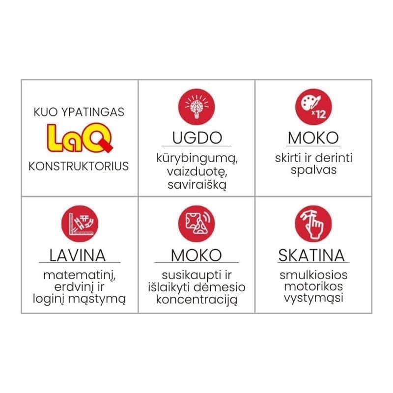 Šio LaQ konstruktorių rinkinio net 10 ryškių spalvų detalės padės vaikams geriau išreikšti save, išmokti jas skirti ir derinti tarpusavyje. Įvairiaspalvės detalės leis vaikams nevaržomai pasinerti į spalvingą fantazijų pasaulį ir kurti nuotaikingus personažus, daiktus ir pan. LaQ konstruktoriai – smagūs ir įdomūs lavinamieji žaislai.