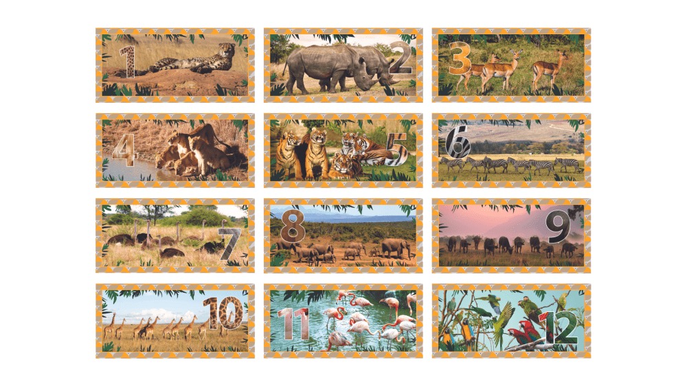 - Kiekvienas skaičius iliustruotas tokiu pat kiekiu laukinių gyvūnų.