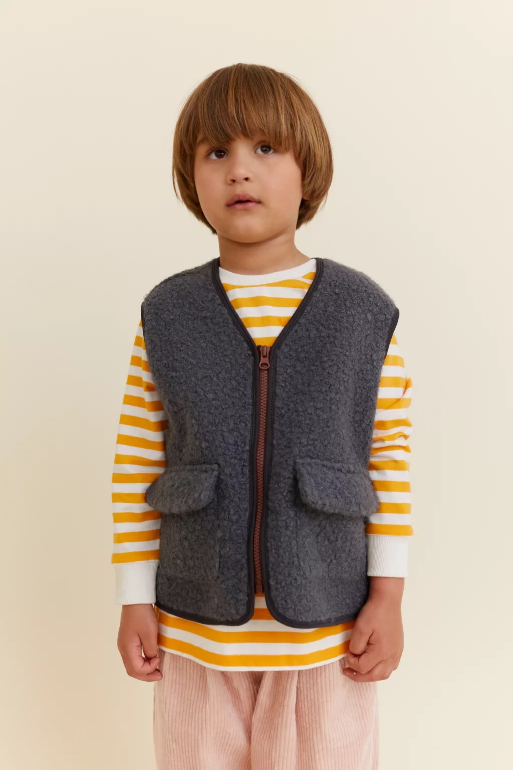 Ši liemenė pagaminta iš minkšto buklė audinio, su užtrauktuku ir dviem didelėmis kišenėmis. Sluoksniuok šią liemenę su megztiniais ir švarkeliais.